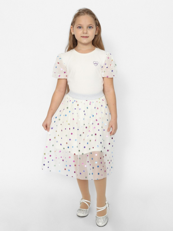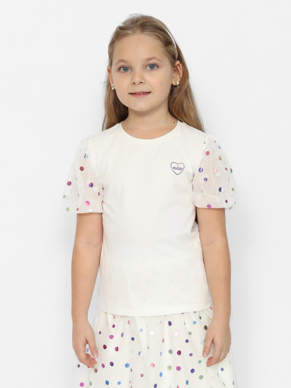 Блузка из кулирки с эластаном прилегающего силуэта, с короткими рукавами. Горловина обработана окантовкой из основного полотна. Объемные рукава-фонарики из сетки с блестящими кружочками "конфетти". Спереди блестящая шелкография глиттером.
