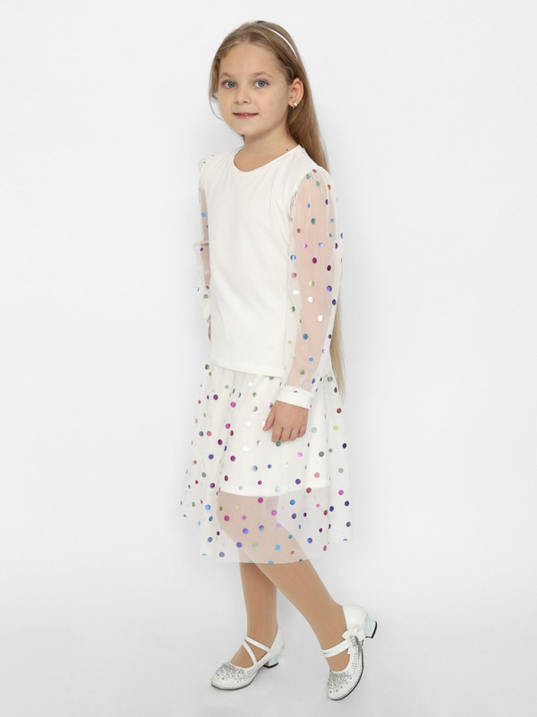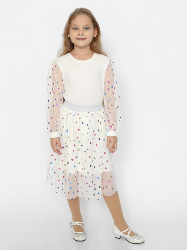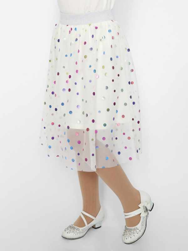 Нарядная двухслойная юбка для девочки из сетки, с блестящими кружочками "конфетти". Эластичный пояс с люрексом. Подкладка выполнена из хлопкового трикотажа. Подкладка короче верхнего слоя сетки.