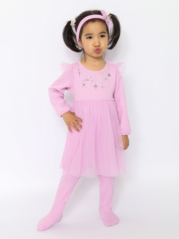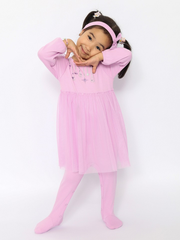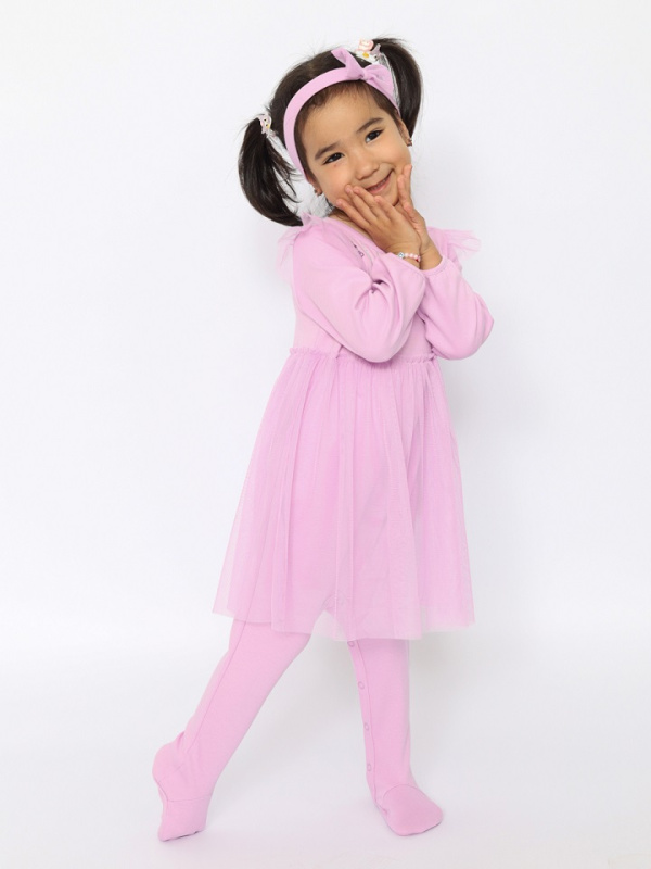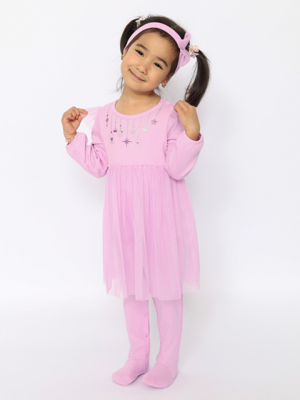 Комбинезон для самых маленьких очаровашек, с длинными рукавами. Горловина и манжеты окантованы бейкой из основного полотна. Спереди блестящая шелкография глиттером. Юбка и воланы из сетки. Бандана с резинкой. Ширина банданы 6 см, резинки 3 см. Цветок из сетки.