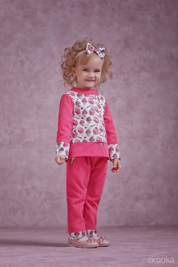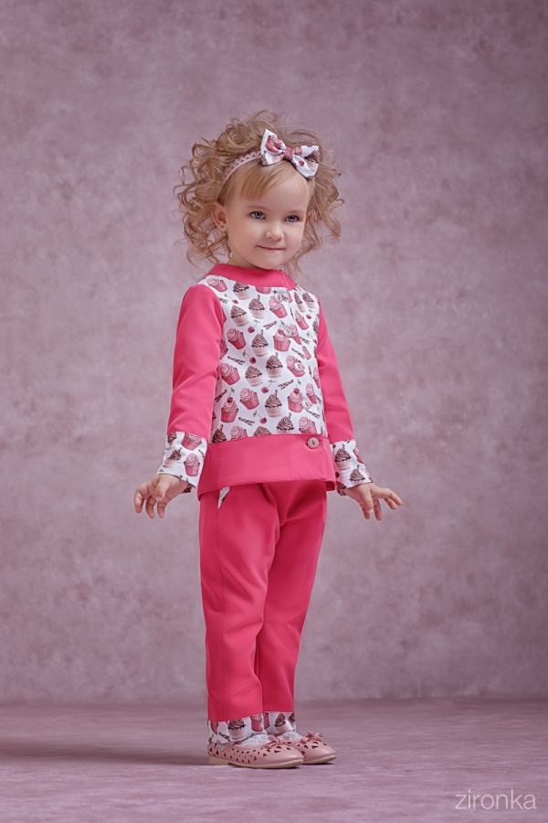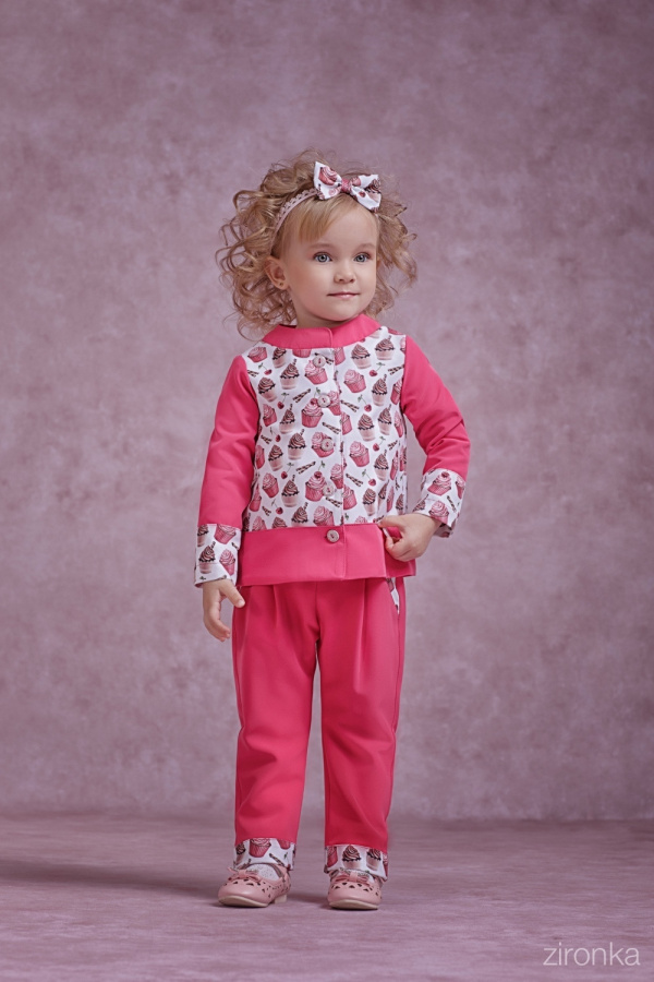 Жакет и брюки яркого малинового цвета для девочки. Материал - костюмная ткань "Барби". Жакет прямого кроя с пирожными на полочке изделия и манжетах, которые напечатаны гипоаллергенной краской. Застегивается красивыми декоративными пуговицами. Брюки прямого кроя с таким же принтом на манжетах, имеют евро резинку в поясе, это позволяет легко отрегулировать посадку по талии. А милый принт придаст образу легких и игривых ноток.
