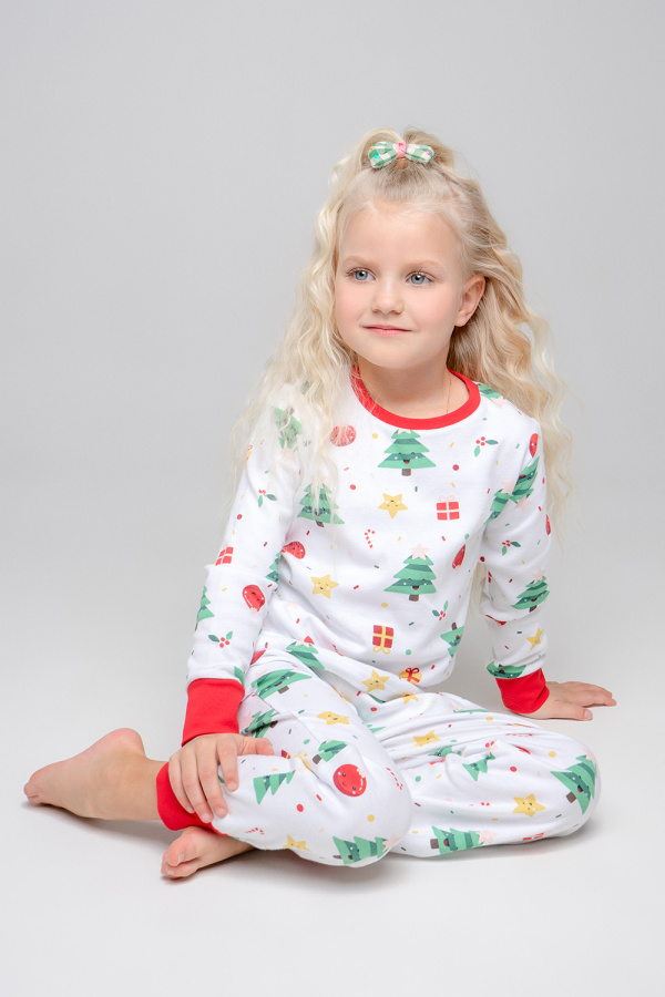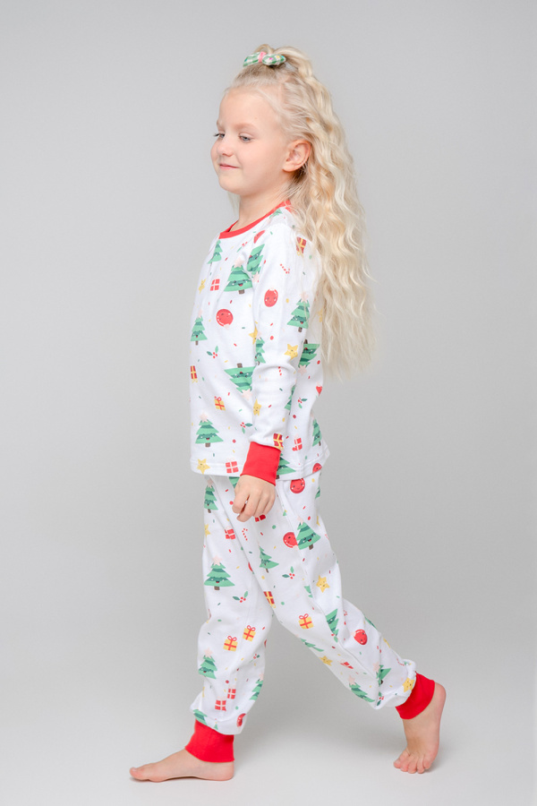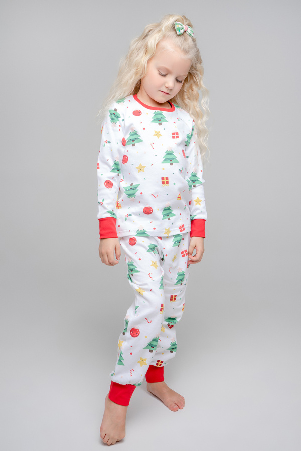 Новогодняя трикотажная пижама из натурального хлопка. У комплекта мягкие, высокие манжеты, в брюках эластичный пояс на резинке. Оригинальные принт и набивка выполнены из стойких, гипоаллергенных текстильных красителей. Пижама сохраняет цвет и форму после многократных стирок. Все трикотажные полотна производятся в соответсвии с нормами Швейцарского сертификата ЭкоТекс.