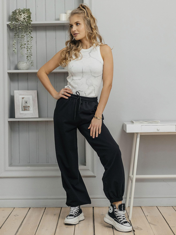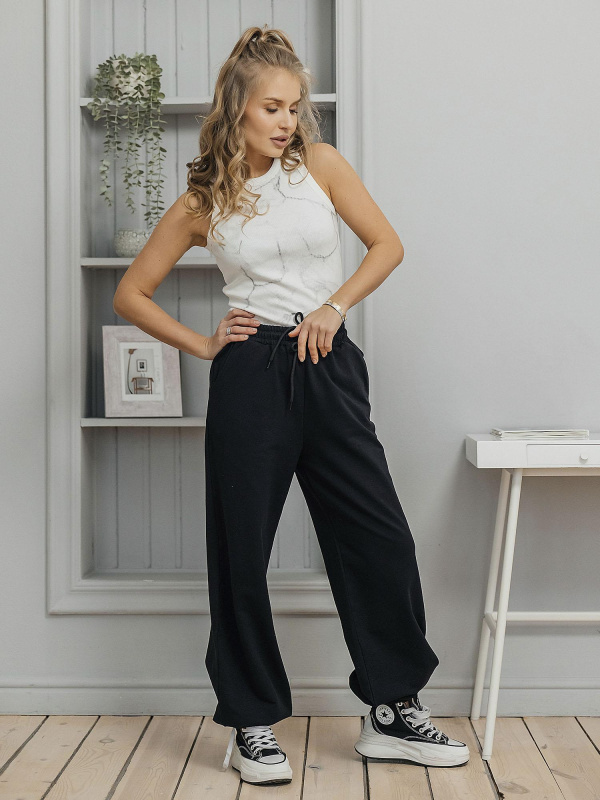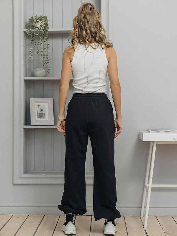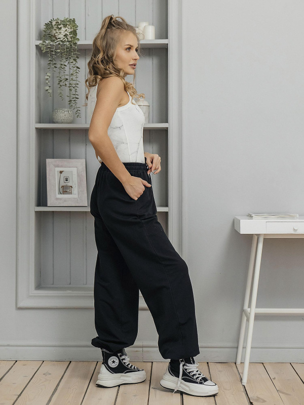 Брюки унисекс из футера 2-х нитки (95% хлопок, 5% эластан). Плотный, мягкий и эластичный материал обеспечивает комфортную посадку, не сковывает движения и сохраняет форму после стирки. Практичный вариант для повседневного гардероба. Цвет — чёрный.