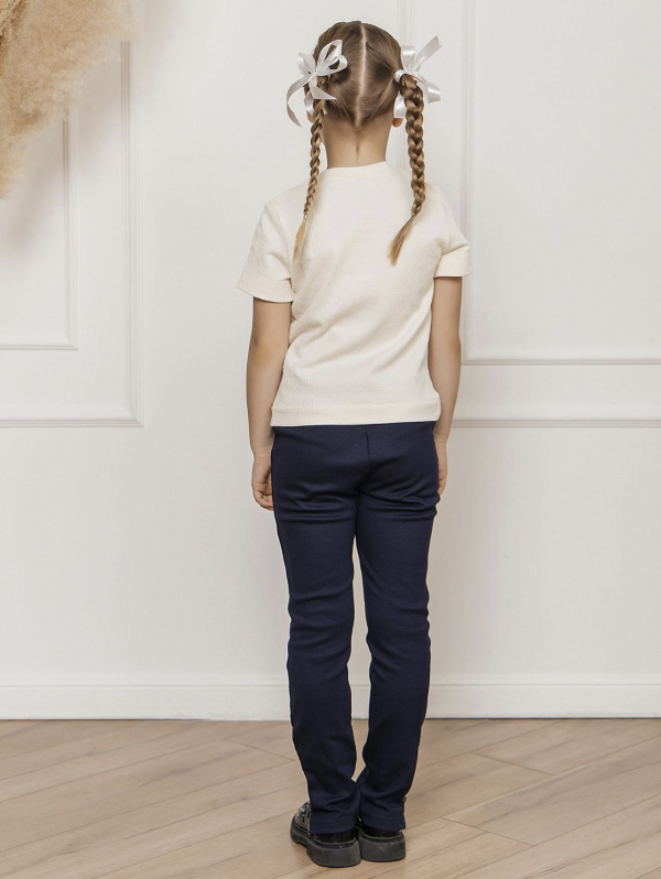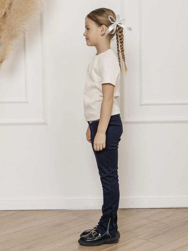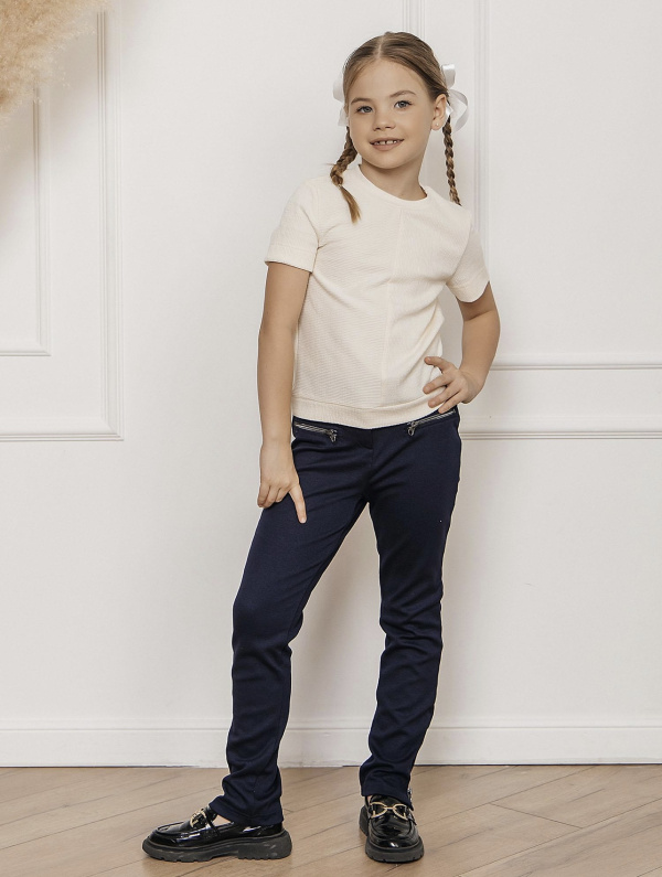 Топ из фактурного трикотажного полотна с короткими рукавами. На передней и задней части модели скомбинированы разные направления узора. Притачной пояс.
