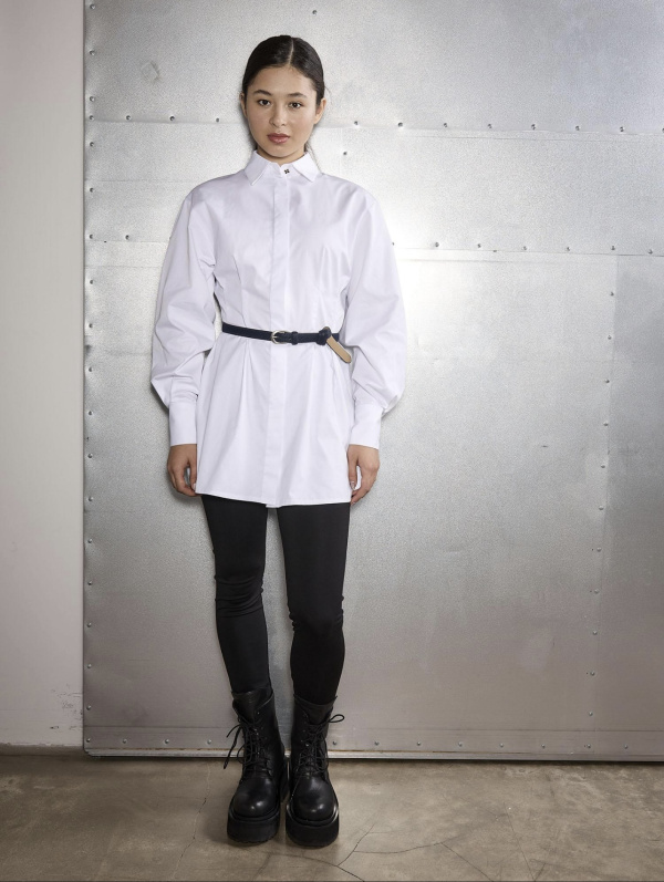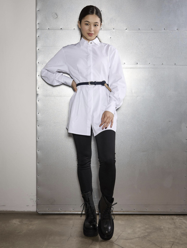 Удлиненная рубашка-платье , с защипами на талии. Объемный спущенный рукав на высокой манжете. Супатная застежка. Дополнение красивый ремень. 60% хлопок, 40% полиэстер