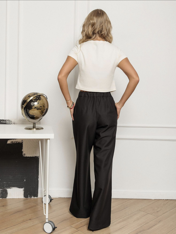 Модные и стильные брюки-палаццо с асимметричным запахом и высокой посадкой на талии. Сзади по талии резинка в поясе, есть боковые карманы. Застежка "гульфик" спереди.