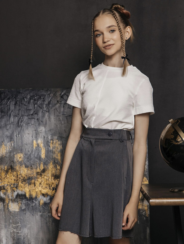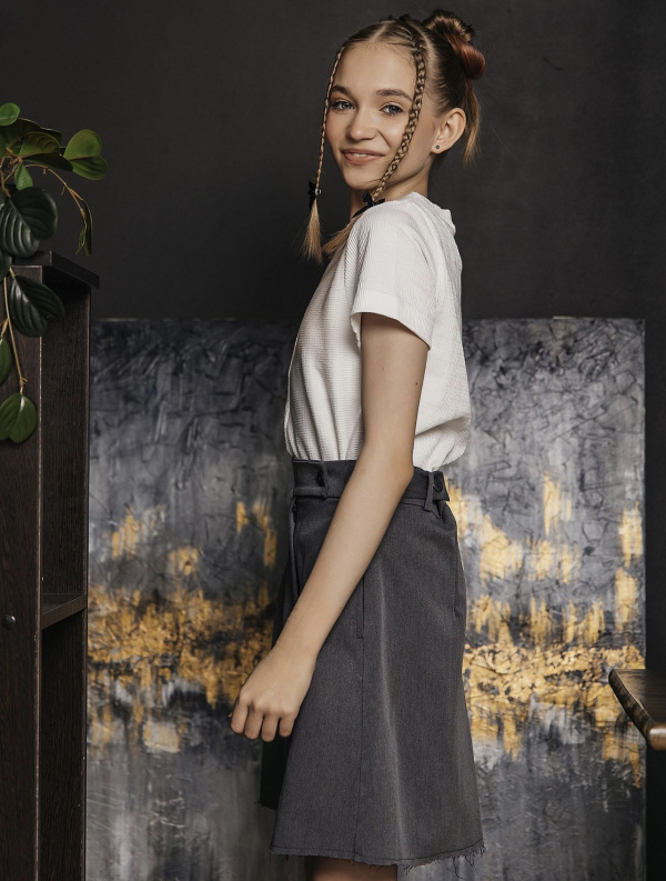 Юбка из костюмной ткани, с хлястиками по бокам котрые позволяют изменить посадку по талии. Спереди боковые карманы и складки. Застежка "гульфик". Нижний срез не обработан.