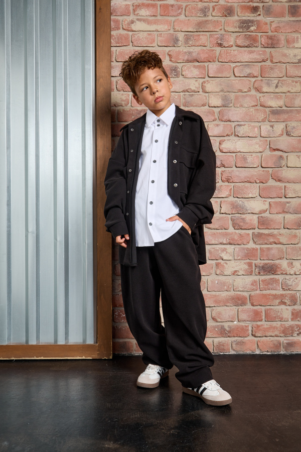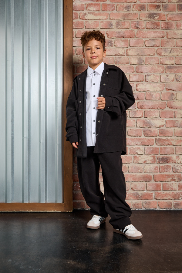 оверсайз из плотного трикотажа с ворсом с длинным рукавом на манжете. Спереди накладные карманы, слева карман с клапаном. Левая часть переда и спинка с кокеткой. Отложной воротник. Застежка на кнопки.