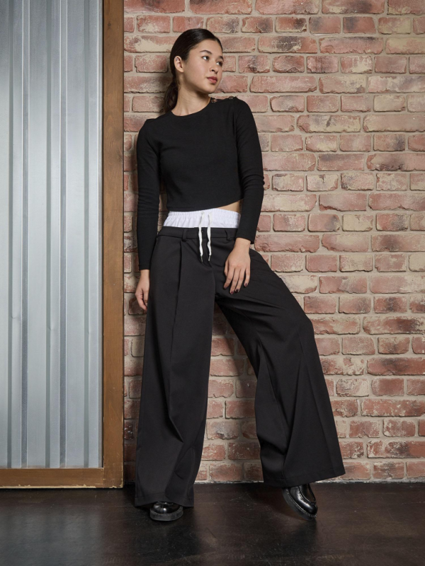 Элегантные брюки для девочки с завышенной талией. Стильный двойной пояс – широкая резинка + регулируемый шнурок для идеальной посадки. Завышенная линия талии. Умный крой – складки, переходящие в стрелки, добавляют классическую строгость. Практичные боковые карманы. Черный оттенок – универсальный цвет для школы и праздников. Качественный материал и комфортная посадка – не сковывает движения. Сдержанный дизайн – подходит для дресс-кода. Идеальный выбор для учебы, торжеств и повседневной носки.