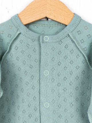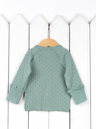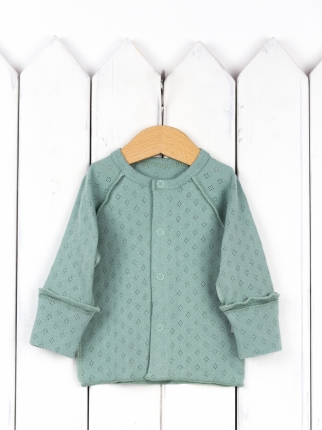 Распашонка с центральной застежкой на кнопках, рукавами реглан с высокими антицарапками. Выполнена швами наружу из ажурной рибаны (100% хлопок).