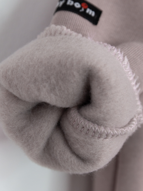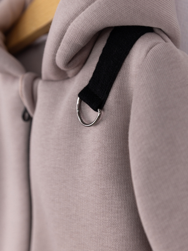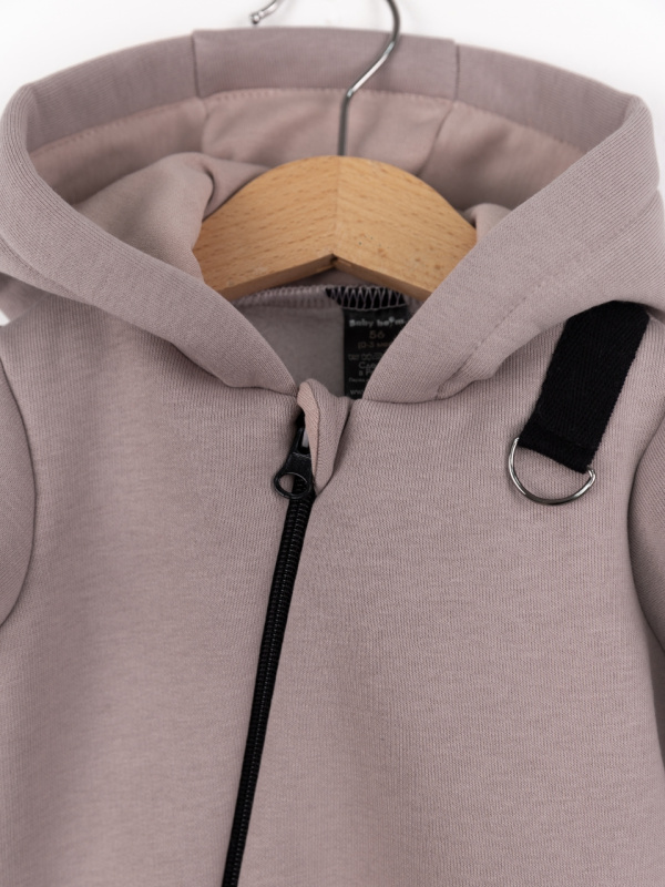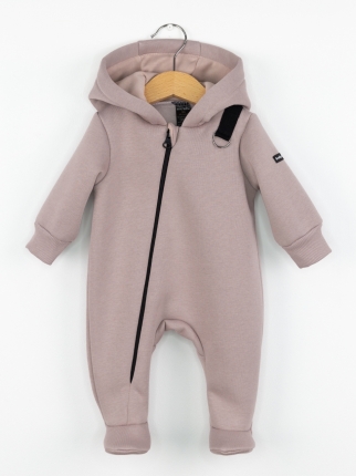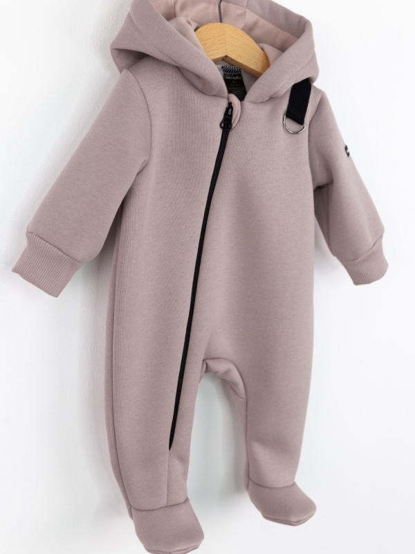 Комбинезон с петлей для пристегивания соски или прорезывателя, с капюшоном и косой молнией. Выполнен из футера 3-нитки с начёсом (80 % хлопок, 20 % полиэстер).