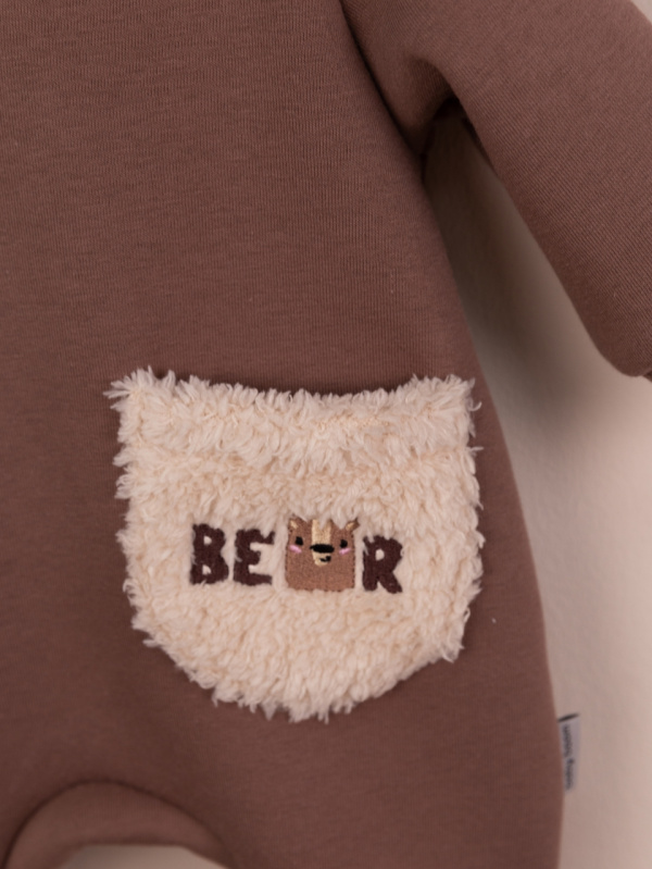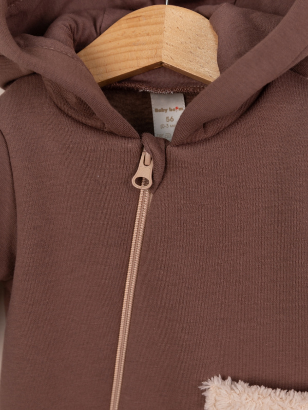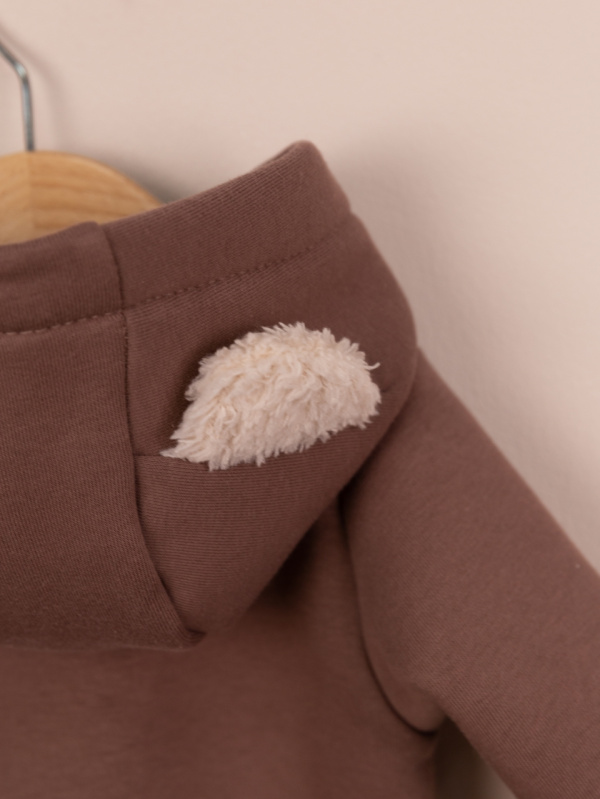 Комбинезон с вышивкой на кармане по переду, с капюшоном и косой молнией. Капюшон украшен милыми ушками из велсофта. Выполнен из футера 3-нитки с начёсом (80 % хлопок, 20 % полиэстер).