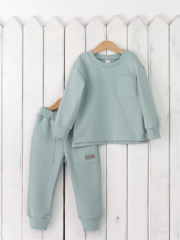 Базовый однотонный комплект из футера 2-нитки (95% хлопок, 5% эластан), состоит из джемпера с накладным карманом и небольшими разрезами по бокам, и брючек с большими накладными карманами и манжетами по низу.