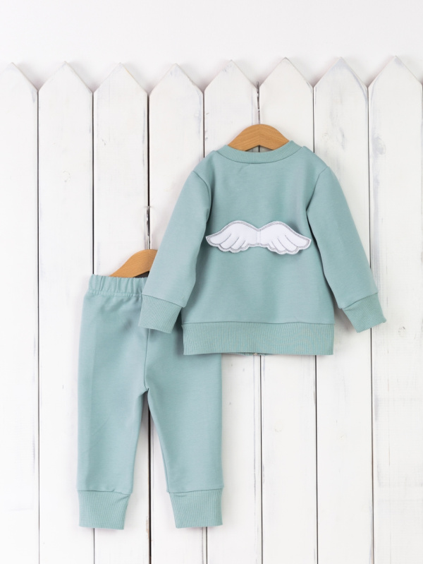 Комплект из футера 2-нитки (95% хлопок, 5% эластан). В комплект входит джемпер на молнии и брюки. По переду джемпера выполнена печать глиттером, спинку украшена апликацией "крылышки".