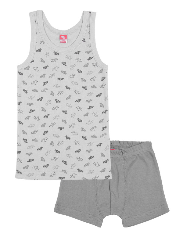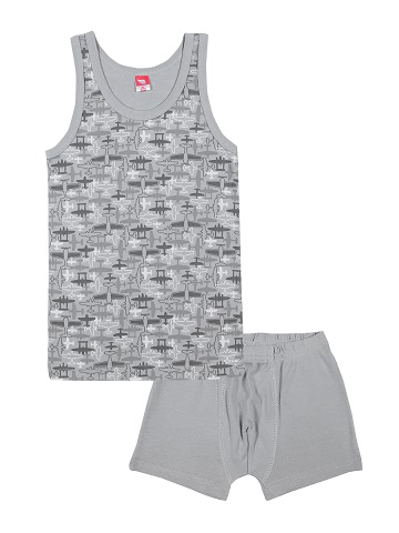 Комплект из трусов-боксеров и майки. Горловина и проймы майки обработаны окантовкой из гладкого полотна в цвет основы. По окантовкам проложена декоративная строчка с застилом отделочного цвета. Верхние и нижние срезы трусов-боксеров обработаны плоским швом вподгибку. По верху одновременно проложена резинка. Швы притачивания вставки и ластовицы спереди оформлены декоративной строчкой в цвет основы.