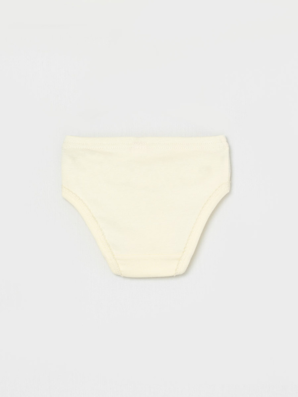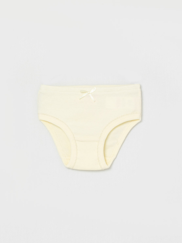 Трусы для девочки. Верхний срез обработан швом вподгибку с предварительно притачанной резиной. Срезы пройм ножек окантованы бейкой и декорированы строчкой с воздушными петлями. На передней половинке вверху посередине - атласный бантик в цвет полотна.
