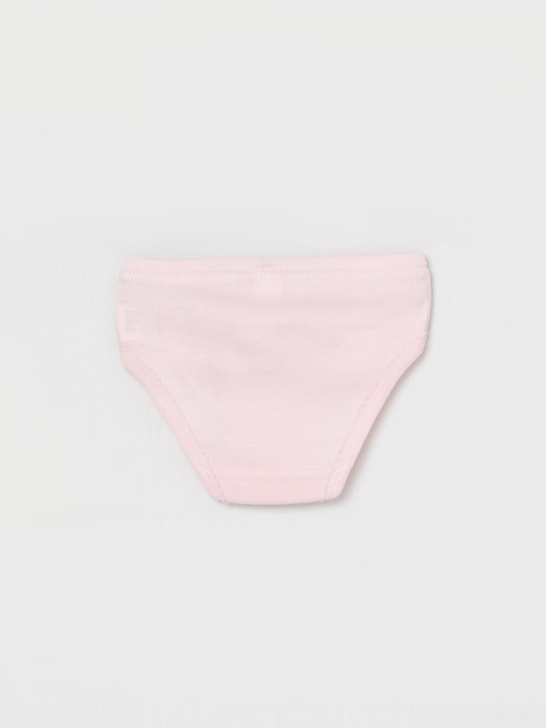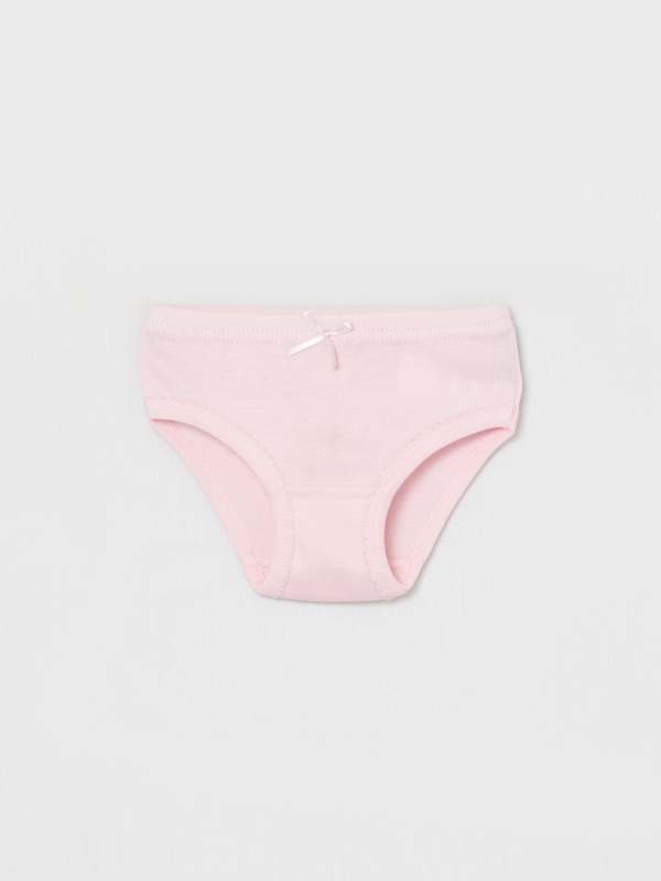 Трусы для девочки. Верхний срез обработан швом вподгибку с предварительно притачанной резиной. Срезы пройм ножек окантованы бейкой и декорированы строчкой с воздушными петлями. На передней половинке вверху посередине - атласный бантик в цвет полотна.