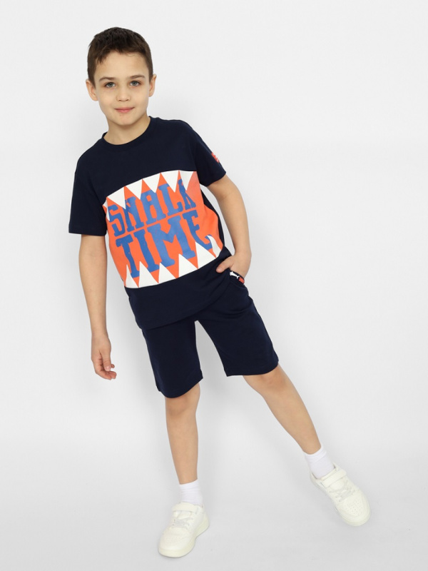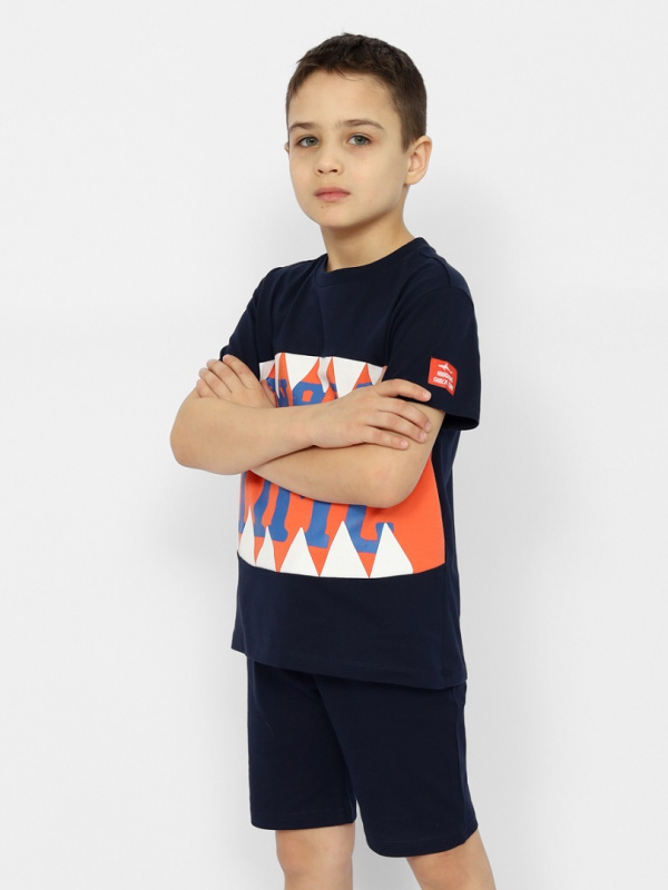 Футболка для мальчика из кулирной глади. Горловина обработана притачной бейкой из рибаны с эластаном. Перед разрезной, центральная часть переда контрастного цвета с принтом "Время перекуса". Рукав декорирован вязаной нашивкой.