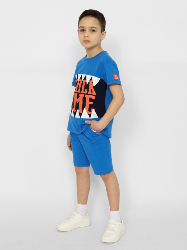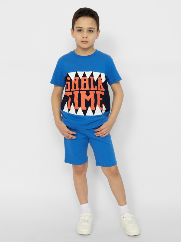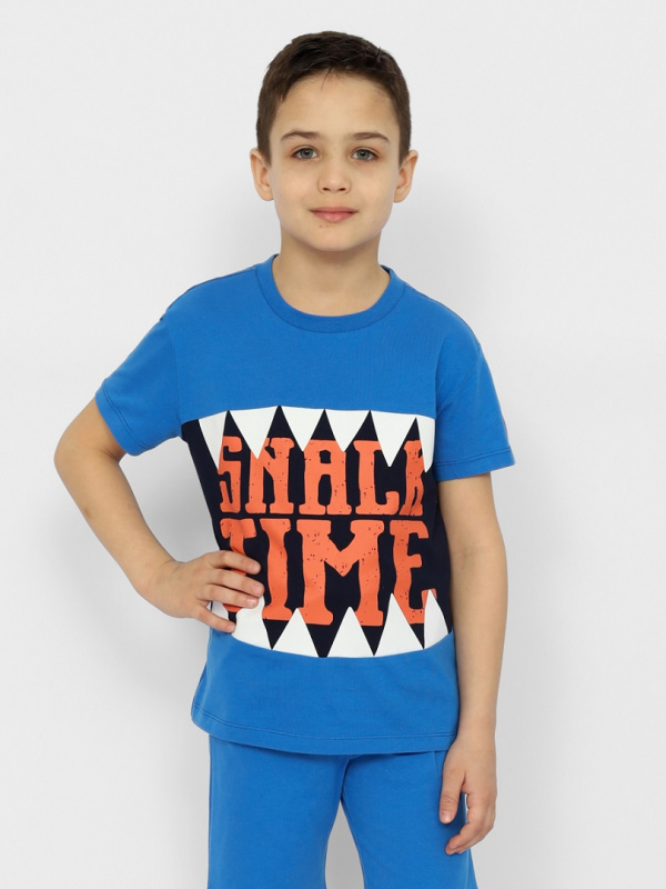 Футболка для мальчика из кулирной глади. Горловина обработана притачной бейкой из рибаны с эластаном. Перед разрезной, центральная часть переда контрастного цвета с принтом "Время перекуса". Рукав декорирован вязаной нашивкой.