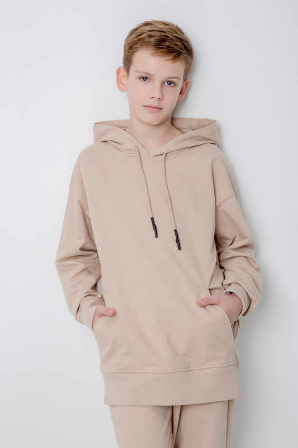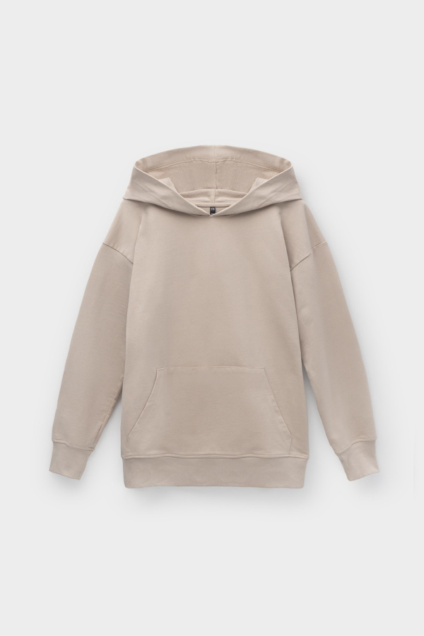 Толстовка с капюшоном из петельчатого футера, произведенного из натурального хлопка. У изделия спущенные плечи, карман-кенгуру, манжеты и пояс из кашкорсе. Толстовка сохраняет цвет и форму после многократных стирок.