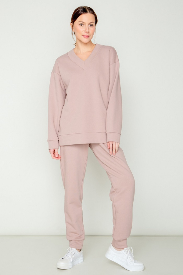 Мягкий однотонный джемпер с V-образным вырезом и длинными рукавами из мягкого петельчатого футера трёхнитка. Воротник, манжеты и пояс выполнены из основного полотна. В составе 80% натурального хлопка и 20% полиэстера, при этом полиэстер ввязан внутрь по особой технологии и не соприкасается с кожей. Свободная посадка и спущенные плечи придают джемперу объём .
