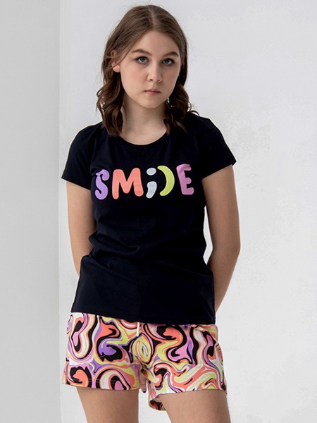 Футболка слегка полуприлегающего силуэта, длиной до бедер. Короткий рукав. Круглая горловина обработана узкой притачной обтачкой из рибаны с эластаном. По горловине отстрочка. По ростку проложен усилитель из экстрафорной ленты. На полочке выполнена шелкография мягкими красками.