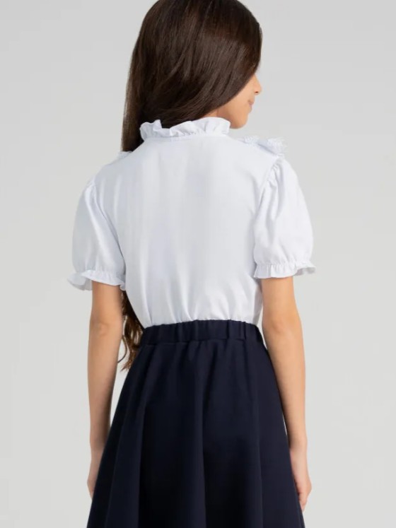 Блузка трикотажная полуприлегающего силуэта. Декорирована воланами с кружевом. Эластичная резинка по низу рукавов. Застежка на кнопки. Высокое содержание хлопка 95%. Благодаря наличию эластана в составе ткани, изделие проще в уходе и держит форму.