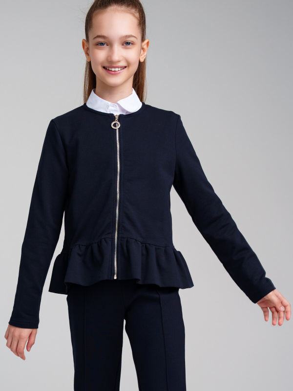 Жакет трикотажный прямого силуэта. Декоративная рюша по низу изделия. Застежка на молнию.