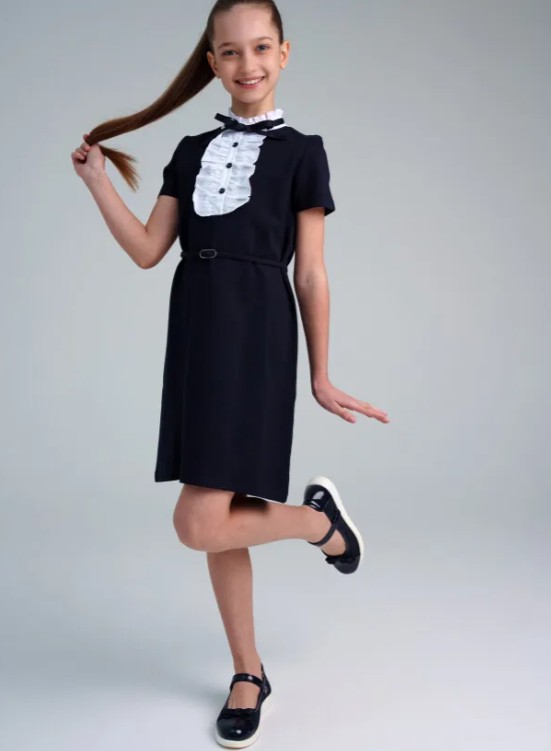 Платье из плотного трикотажного полотна. Мягкий, эластичный материал, благодаря прочному плетению хорошо держит форму, не мнется, не растягивается. Полуприлегающий силуэт. Застежка на пуговицы. Декор - жабо, выполненное из текстиля и кружева. Текстильный пояс с пряжкой.