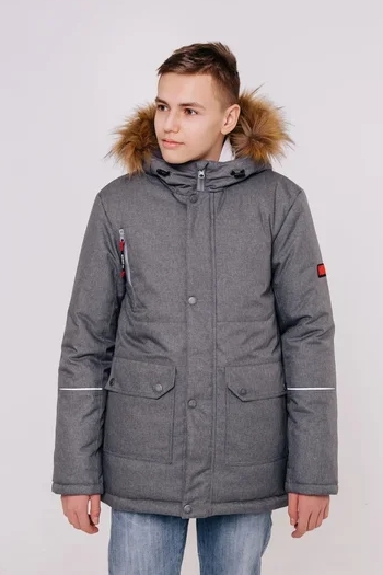 Куртка для мальчика Холден зимняя из новой коллекции Зима-2021. Модная и лаконичная куртка для подростков выполнена из мембраны, утеплена флисом и слайтексом. Капюшон с искусственной съемной опушкой. Цвет серый и синий, нашивки и навесы молнии контрастного цвета.