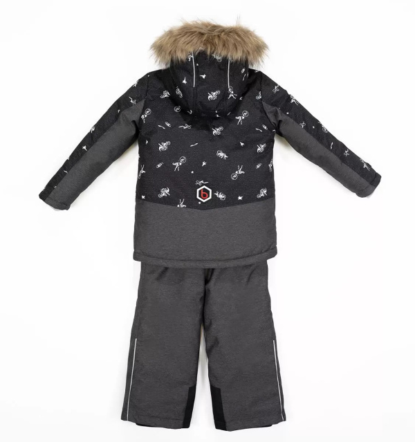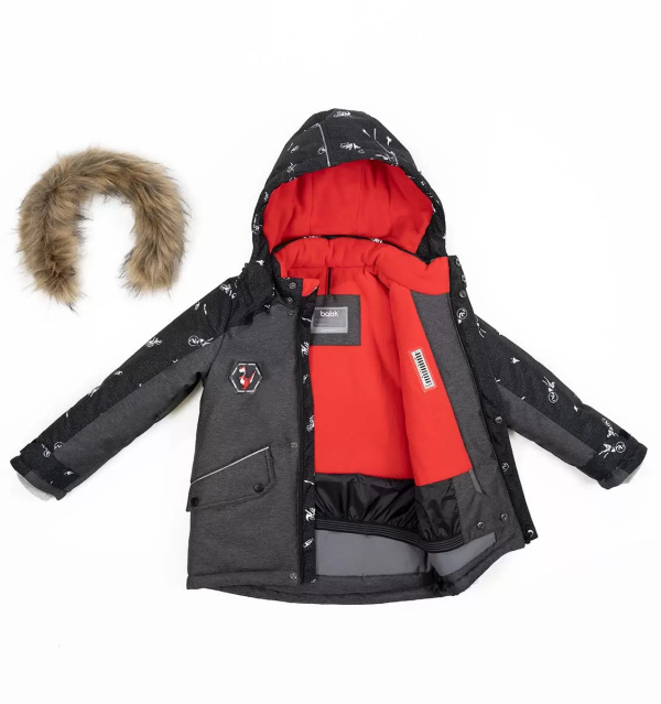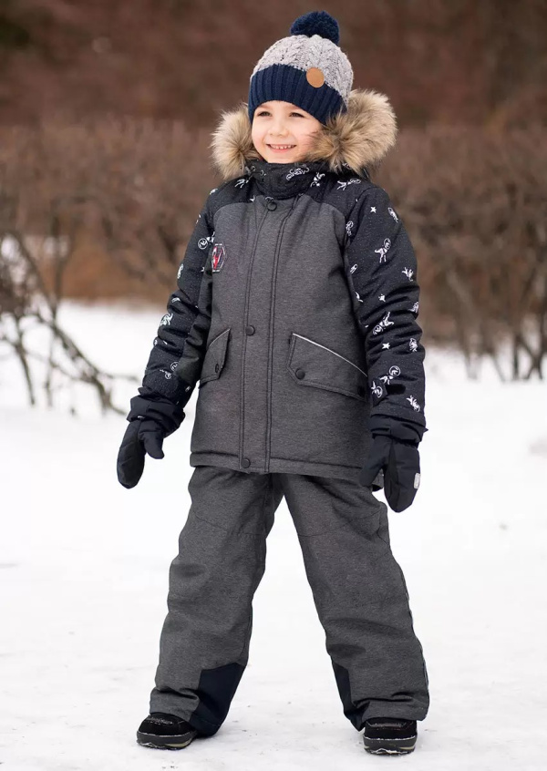 "В комплект входит куртка с капюшоном и полукомбинезон на бретелях. Утепление в виде флисового подклада и слоя слайтекса внутри. Оригинальный принт с динозаврами.