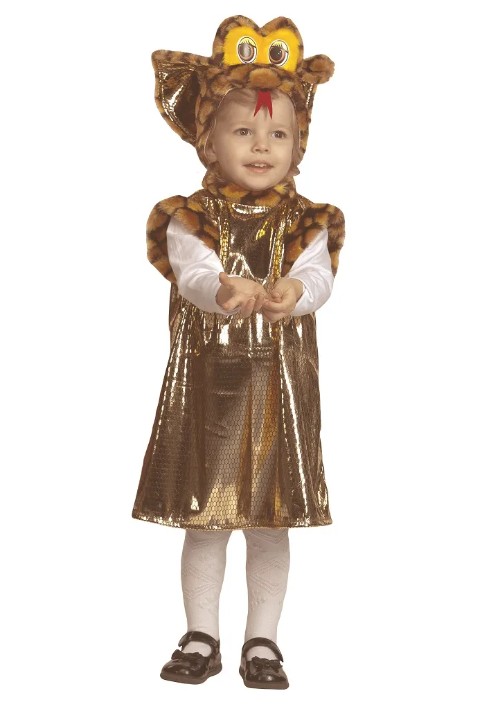 Золотой сарафан с рисунком, имитирующим змеиную кожу. Рукава и воротничок обшиты мехом со змеиным принтом. Образ завершает головной убор в виде змеиной головы с глазками и язычком.