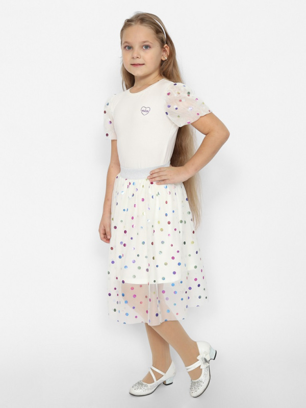 Блузка из кулирки с эластаном прилегающего силуэта, с короткими рукавами. Горловина обработана окантовкой из основного полотна. Объемные рукава-фонарики из сетки с блестящими кружочками "конфетти". Спереди блестящая шелкография глиттером.