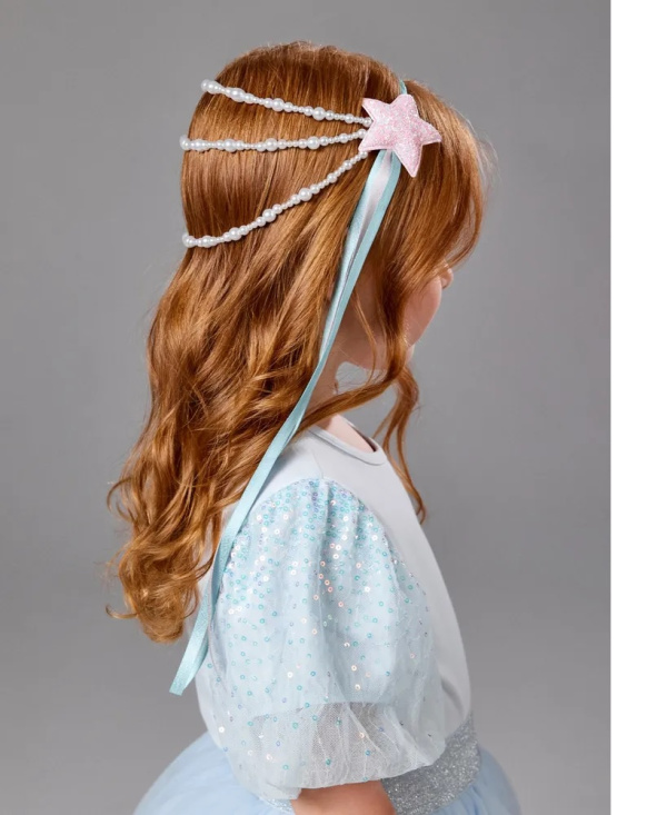 Детский карнавальный ободок со звёздочками и ленточками — это стильное и яркое украшение, которое идеально завершит праздничный или тематический образ. Голубой обруч для волос украшен мягкими текстильными звёздочками, покрытыми глиттером, что придает ему сверкающий эффект и волшебное настроение. Дополнительное украшение в виде бус с искусственными жемчужинами и длинные атласные ленты делают образ более выразительным и запоминающимся. Такой ободок отлично подойдет для утренников, новогодних праздников, фотосессий и тематических мероприятий, добавляя образу игривый шарм и яркость. Он создает ощущение сказочности и волшебства, делая маленькую модницу центром внимания и вдохновения.