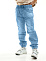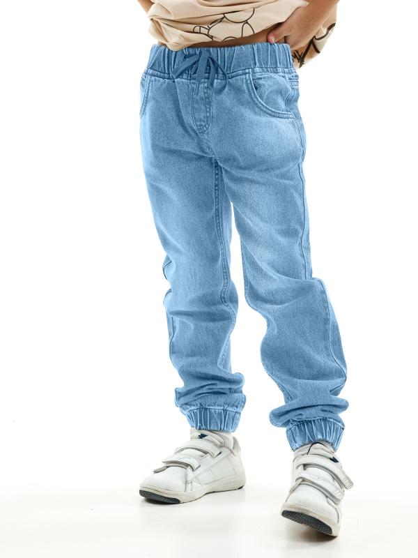 Широкие джинсовые брюки-джоггеры из качественного 100% хлопкового денима, который не растягивается и не теряет форму. Свободные в бедрах штанины, зауженные книзу, с эластичными резинками на манжетах, классическая средняя посадка по талии, эластичный пояс-резинка на завязках, два боковых прорезных кармана и два накладных задних кармана.