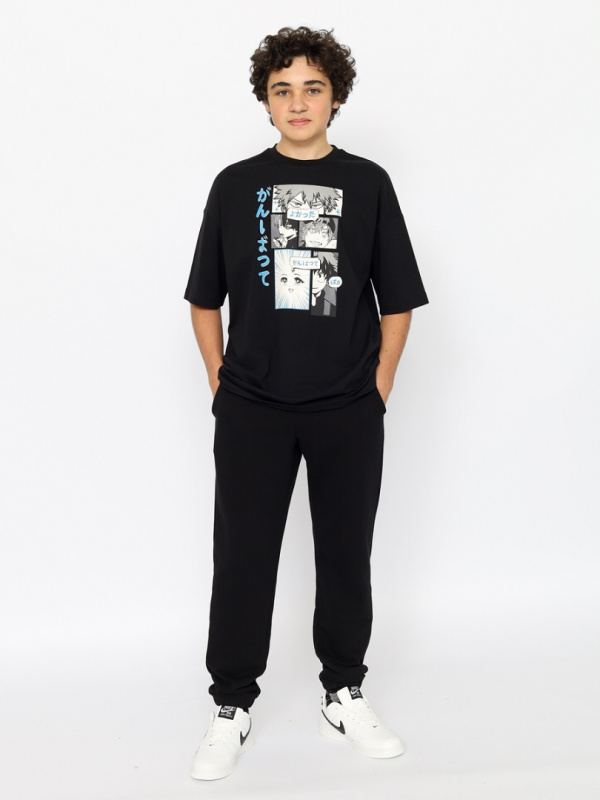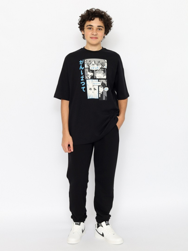 Молодежная футболка oversize с короткими рукавами и выразительным принтом спереди (элементы комикса со словами "спасибо", "выложись на полную", "чудак"). Футболка выполнена из кулирки повышенной плотности. Горловина круглая, оформлена эластичным воротником.