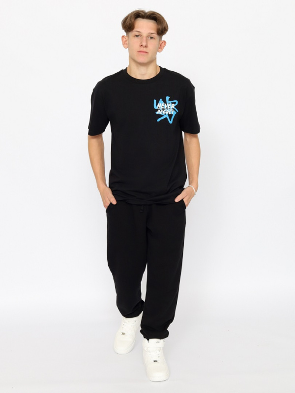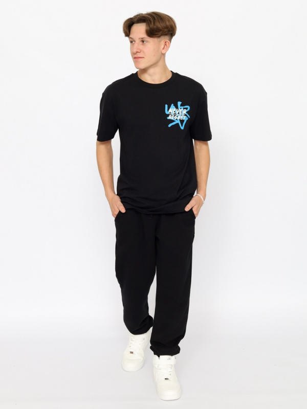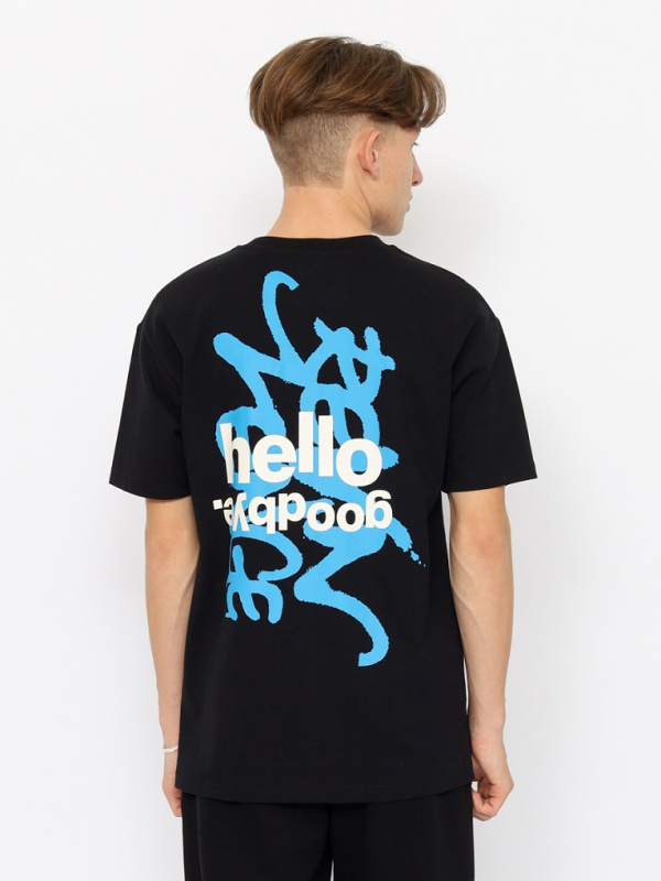 Прямая футболка для молодых мужчин с короткими рукавами. Горловина круглая, оформлена эластичным воротником. Футболка выполнена из кулирки повышенной плотности. Перед и спинка футболки декориованы принтом "никогда не сожалей", "привет", "пока".