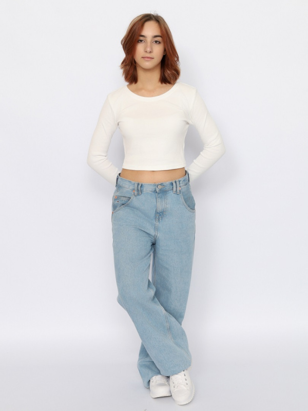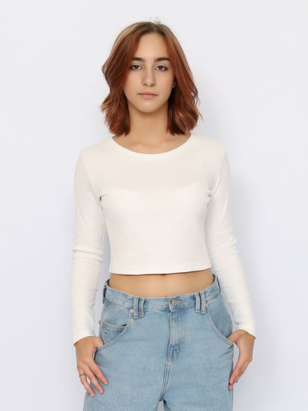 Укороченный молодежный джемпер с длинными рукавами из эластичного полотна в вертикальный рубчик.