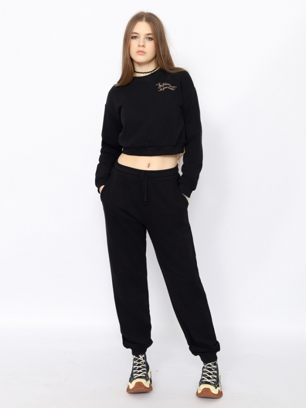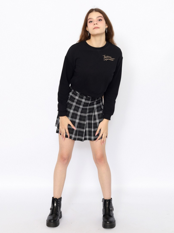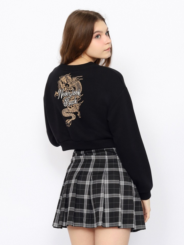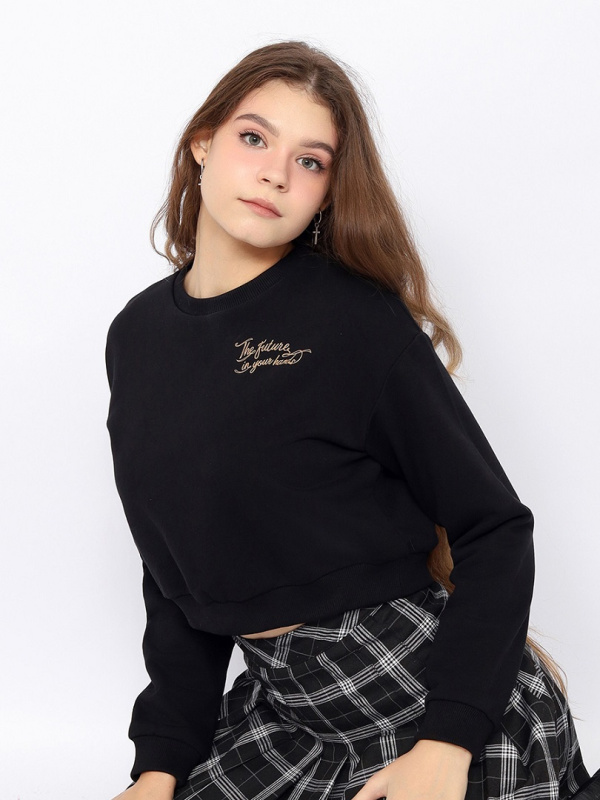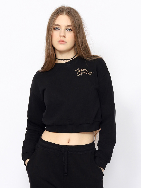 Укороченный джемпер для девушки с длинными рукавами и принтом (никогда не оглядывайся назад) Рукава с манжетами по низу. Нижние срезы переда и спинки оформлены притачным поясом. Пояс, манжеты и воротник сделаны из полотна с эластаном.