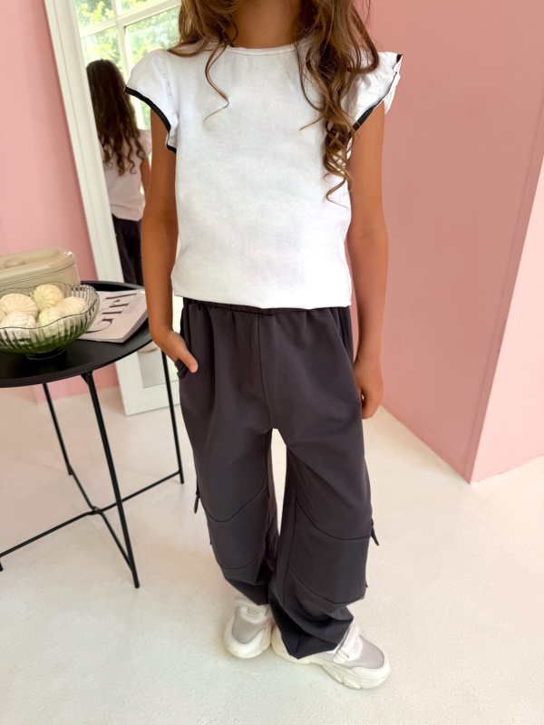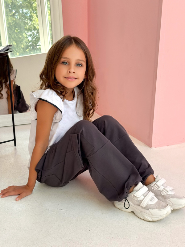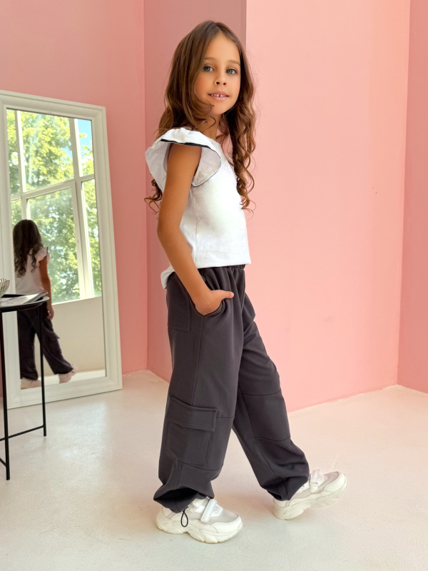 Брюки для девочки: Модные брюки-карго, с накладным карманом, подойдут в качестве повседневной одежды. Свободный силуэт и пояс на завязках не стесняют движений. Внизу затяжки, которые позволяют создать любую длину и фасон брюк. Сзади карман.