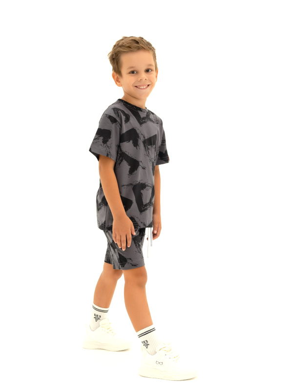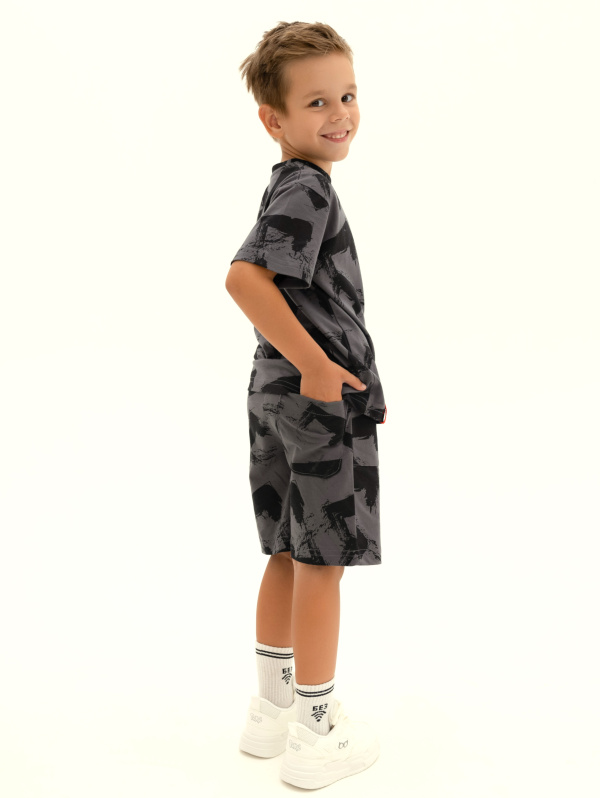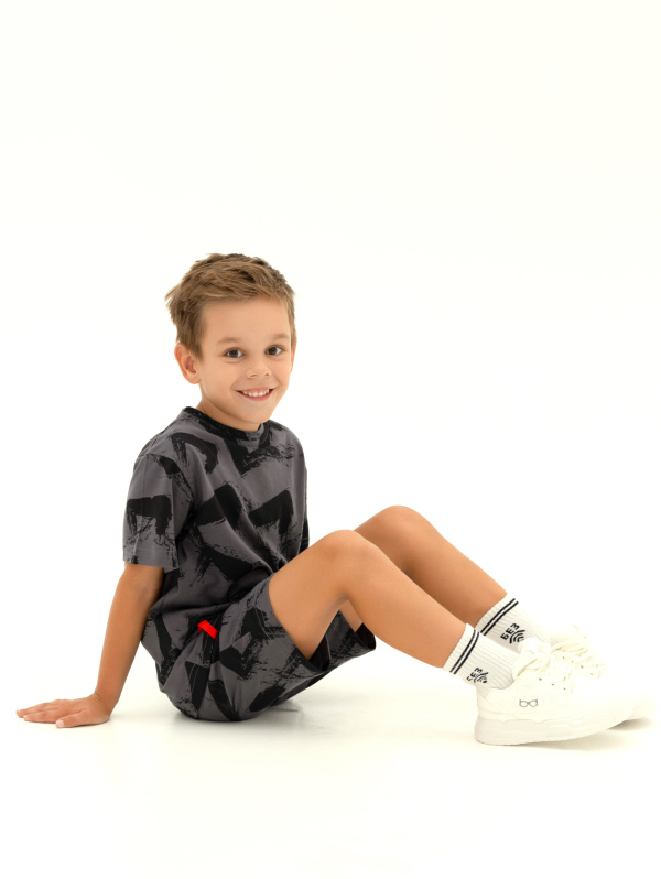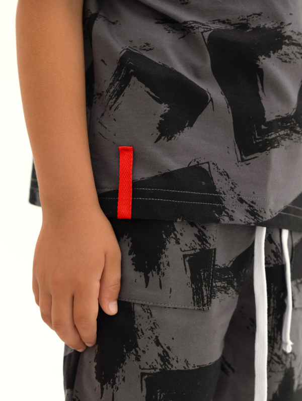 Футболка для мальчика: Футболка с коротким рукавом из набивного полотна. Вырез горловины круглый, обработан притачной бейкой из рибаны с лайкрой. На рукаве и по низу изделия нашиты декоративные флажки.