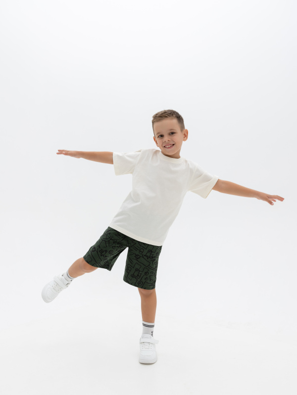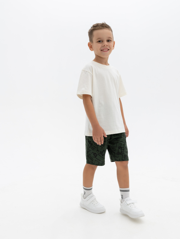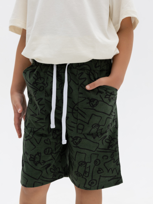 Шорты для мальчика: Верх шорт обработан притачным поясом из основного полотна, внутрь вставлена резинка и шнурок. На передних половинках расположен карман. Полотно с набивкой "абстракция".