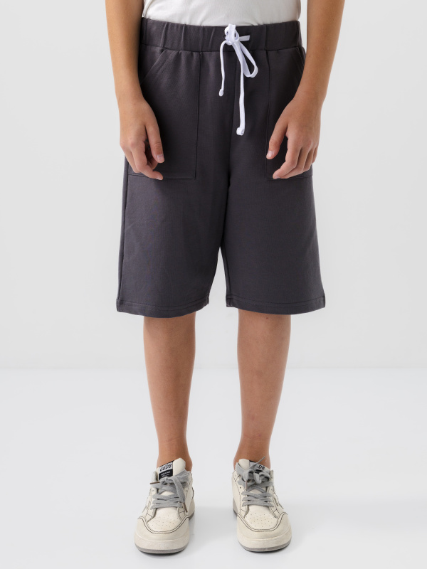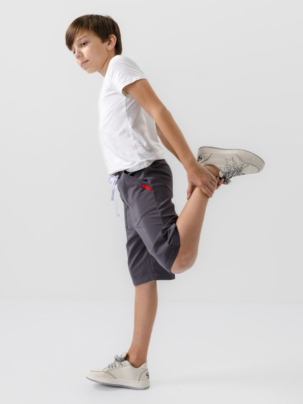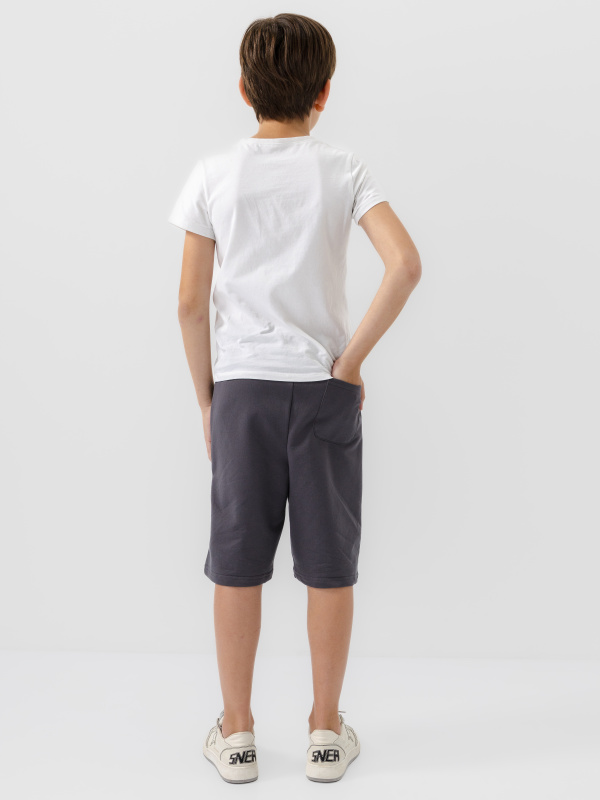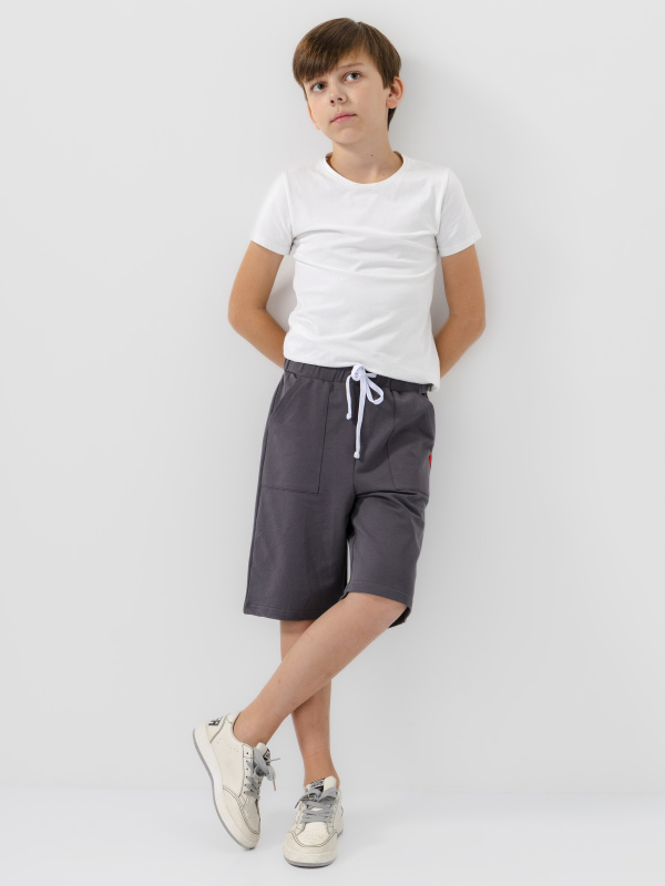 Шорты для мальчика: из футерованного полотна. Верх шорт обработан притачным поясом из полотна с лайкрой и функциональным шнурком. На передних половинках расположен карман. Один из карманов декорирован нашивным флажоком. Сзади расположен карман.