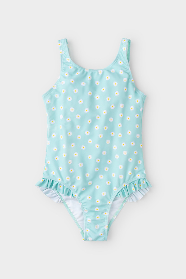 Слитный купальник на лямках для девочки. Украшен бантиками на лямках и оборками по бокам. Оригинальная набивка выполнена из стойких гипоаллергенных красителей.