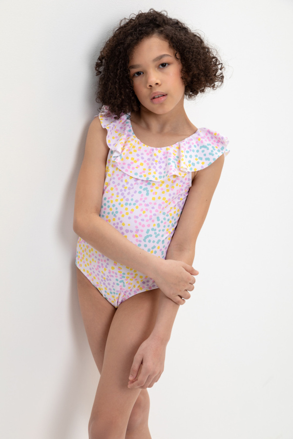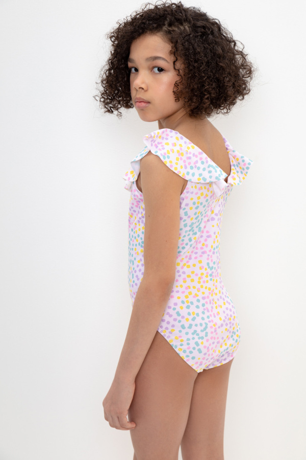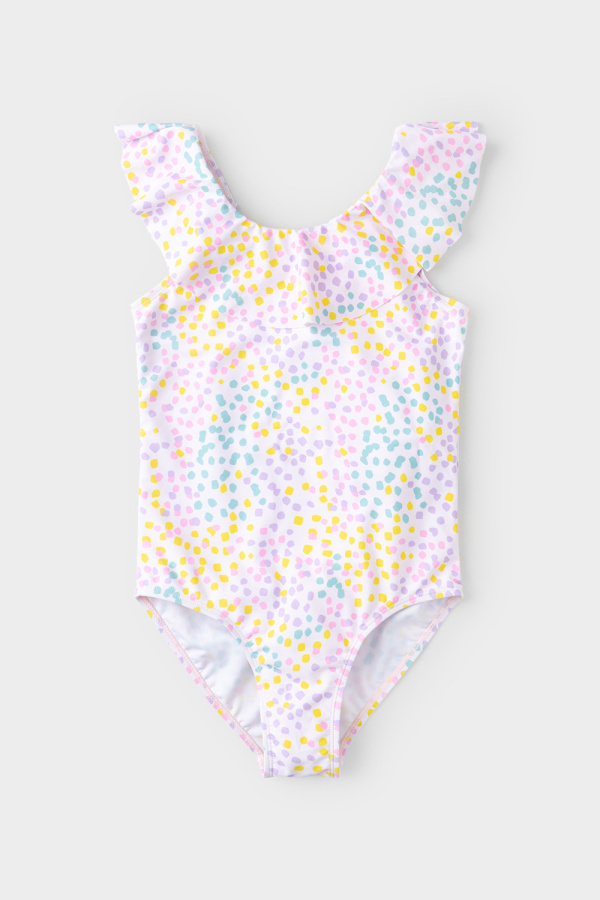 Слитный купальник на лямках для девочки. Украшен оборками. Оригинальная набивка выполнена из стойких гипоаллергенных красителей.