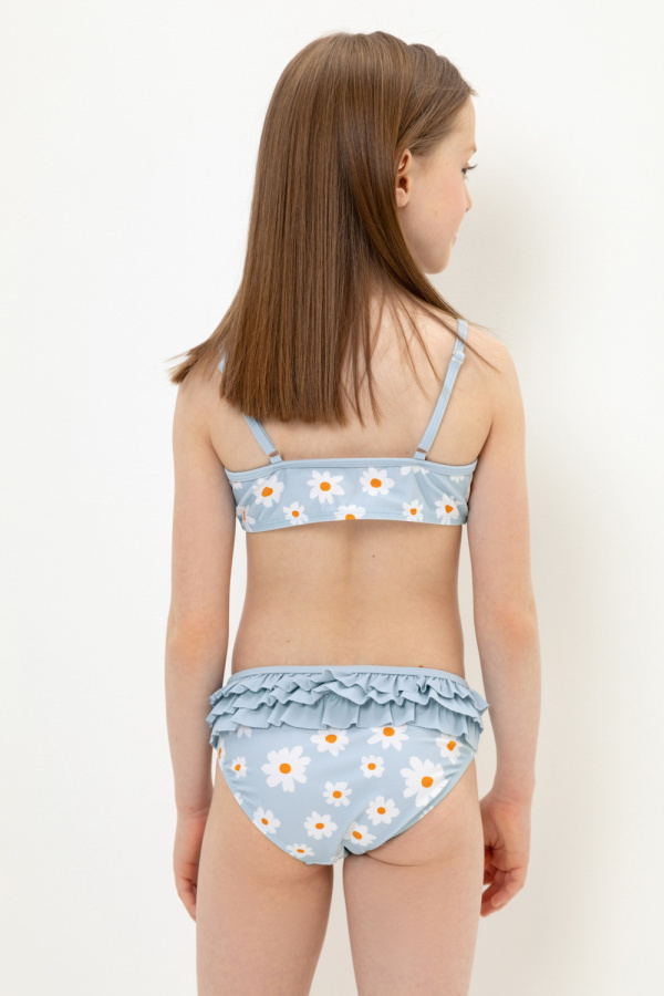 Раздельный купальник для девочки с набивными ромашками. Топ на эластичных бретелях и плавки на резинке. На груди и спинке воздушные оборки.