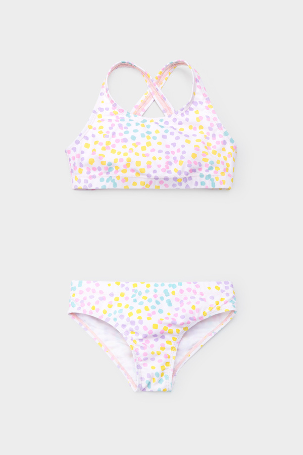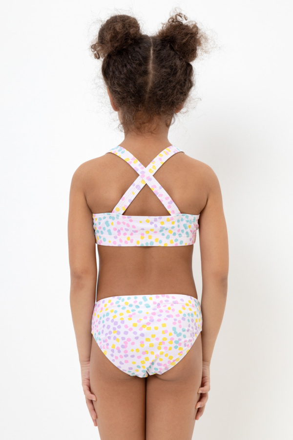 Раздельный купальник для девочки. Топ на эластичных бретелях и плавки на резинке. Оригинальная набивка выполнена из стойких гипоаллергенных красителей.