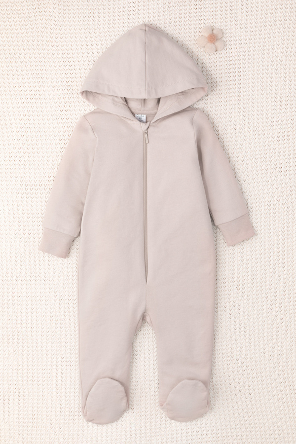 Тёплый комбинезон из футера с начёсом для новорождённых. Застёгивается на молнию. Капюшон с подкладом из интерлока. Эластичные манжеты из рибаны. В размерах 80-92 без ножек с манжетами. Все трикотажные полотна производятся в соответствии с нормами Швейцарского сертификата ЭкоТекс.
