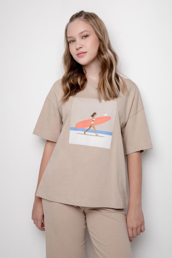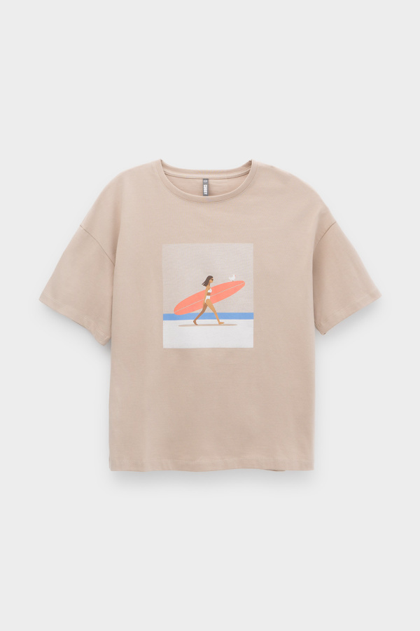 Свободная футболка из длинноволокнистого гребенного хлопка. Спущенное плечо придает изделию свободный силуэт. Оригинальный принт выполнен из стойких текстильных красителей.