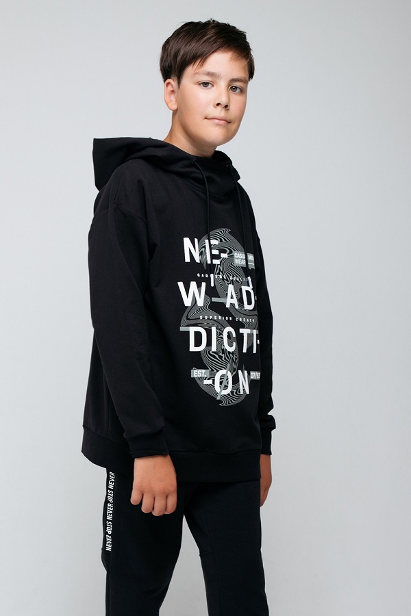 Однотонная толстовка с капюшоном. Сшита из хлопкового трикотажа футер петля. Капюшон с подкладом из супрема утягивается с помощью шнурка. Рукава со спущенными плечами оканчиваются эластичными манжетами. Внизу мягкий пояс.