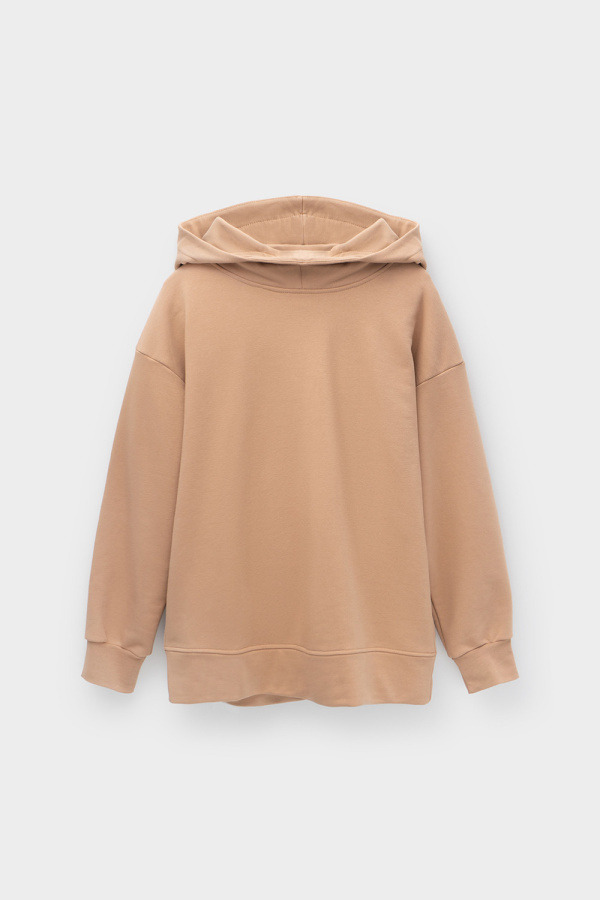 Толстовка из петельчатого футера трехнитки. Капюшон с подкладом из супрема регулируется с помощью шнура. У изделия спущенные плечи, эластичные манжеты и пояс. В боковых швах карманы. Толстовка сохраняет цвет и форму после многократных стирок.